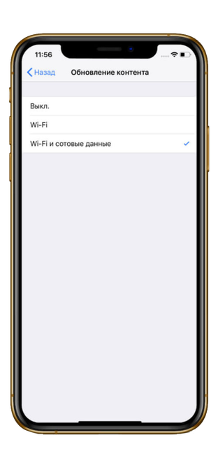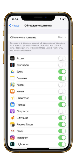 Также рекомендуем открыть пункт «Обновление контента» и выбрать один из двух вариантов: Wi-Fi (средняя экономия заряда) или «Выкл» (тогда будет максимальная экономия).