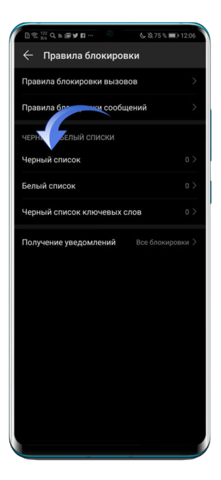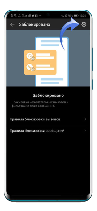 После этого вы сможете ознакомиться с правилами блокировки вызовов и сообщений, где также можно произвести настройки под свои нужды. А теперь можно добавить номер в черный список на вашем Хуавей — нажимаете на иконку шестеренки, которая находится вверху слева.