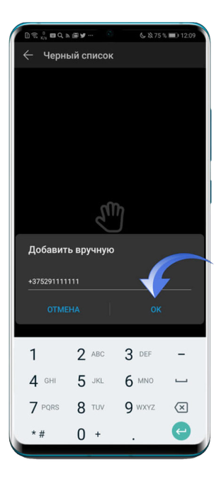Мы выберем пункт «Добавить вручную». После чего появится окно, в котором нужно ввести номер нежелательного абонента, а потом нажать на кнопку «ОК».
