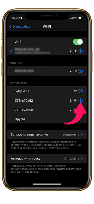 Кликните на иконку i, расположенную в пункте необходимой точки доступа Wi-Fi.