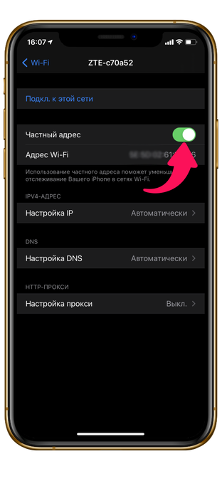 В пункте «Частный адрес» выставьте активное значение. После чего вы увидите, что ваш адрес изменится. Такие же действия следует проделать при подключении вашего Айфон к другим сетям.