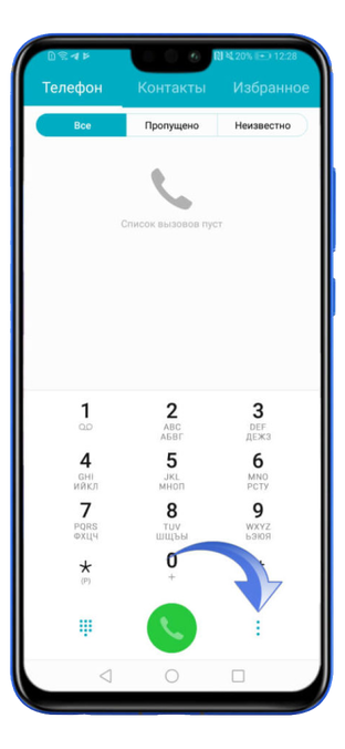 Чтобы включить данную опцию, вам потребуется открыть стандартное приложение «Телефон» и нажать на значок с тремя точками, расположенный в правом нижнем углу.