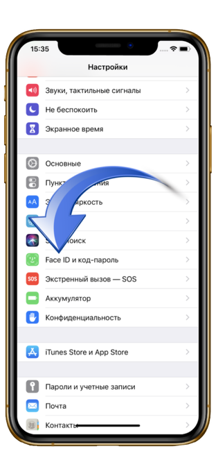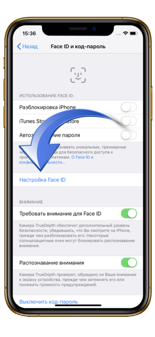 Первым делом нужно открыть «Настройки» и выбрать пункт «Face ID и код-пароль».