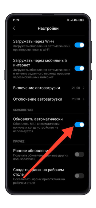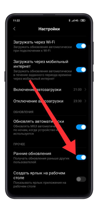 Если вы желаете получать обновления MIUI раньше других пользователей, то вы можете выставить активное значение в пункте «Ранние обновления».