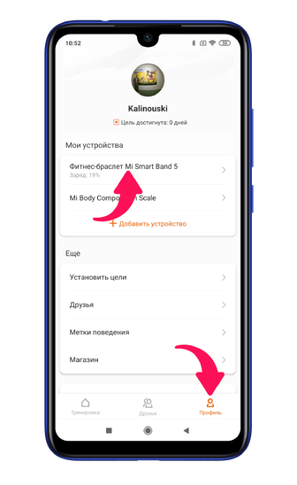 Войдите в Mi Fit, откройте вкладку «Профиль» и нажмите на ваш браслет Сяоми.