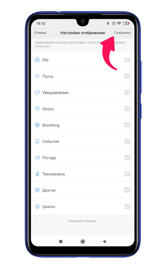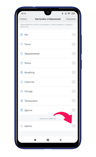В нижней части находится строка «Циклы», вам необходимо удерживать иконку справа на протяжении 3 секунд, после чего поднять саму строчку вверх.