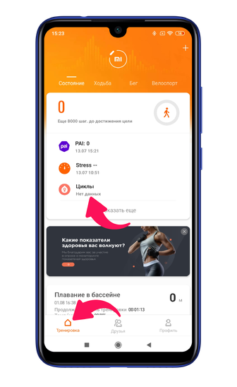 Иконка циклов отобразится на Mi Band 5. Чтобы настроить данную функцию, откройте вкладку «Тренировка» и кликните на «Циклы».