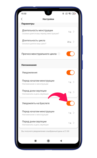 Если вы хотите получать уведомления за пару дней до начала цикла, кликните на клавишу «Настройки» справа вверху и выставьте активное значение в поле «Уведомлять на браслете».