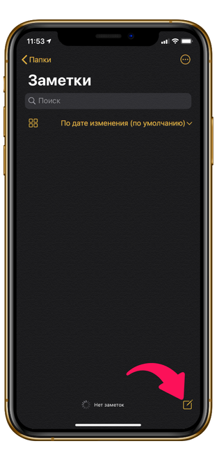 Нажмите на иконку в нижнем углу для создания заметки.