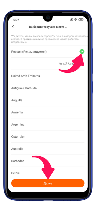Далее выберите регион, поставив галочку рядом со своей страной и нажав на «Далее».