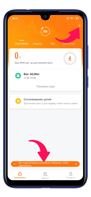 По окончанию регистрации перед вами откроется главное меню приложения. Чтобы добавить ваш Mi Band, нажмите вверху на иконку плюса либо на уведомление снизу.