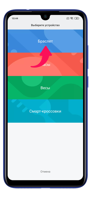 Далее выберите тип устройства — браслет.