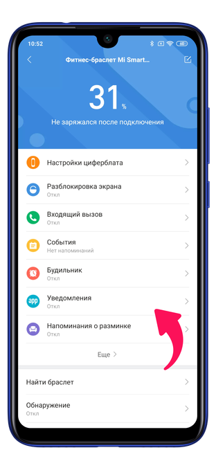 Далее вы можете настроить Xiaomi Mi Band: активировать уведомления, выбрать положение гаджета, включить будильник и др.