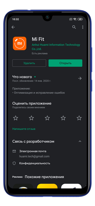 По завершению зарядки приступайте к подключению. Скачайте приложение Mi Fit на ваш смартфон, оно доступно как в «Play Маркете», так и в AppStore.