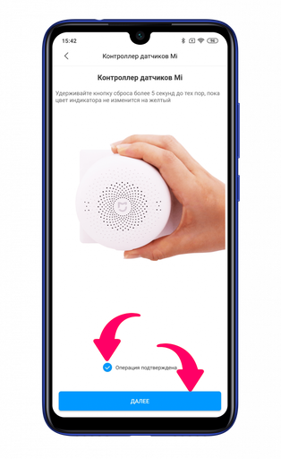Затем следует сбросить настройки контроллера. Для этого удержите клавишу на нем на протяжении 5 секунд, выставьте галочку в приложении и нажмите «Далее».