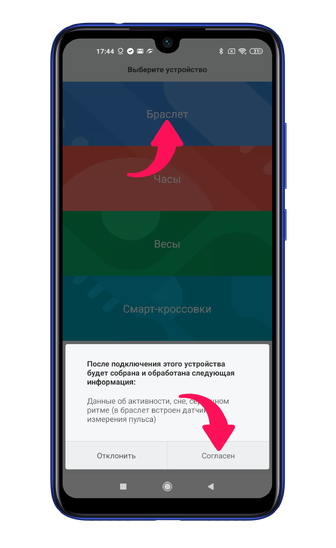 Из доступных гаджетов выберите тип вашего — «Браслет». Во всплывающем уведомлении о сборе данных нажмите «Согласен».
