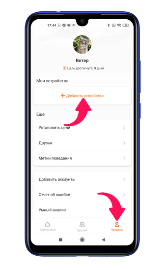 Затем откройте приложение. Если у вас есть аккаунт, авторизуйтесь. Если его нет, пройдите регистрацию. После чего нажмите на кнопку «Профиль», расположенную внизу, и «Добавить устройство».