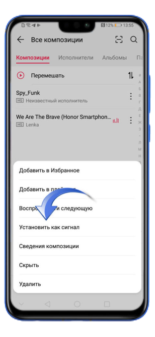 Справа от песни вы обнаружите иконку с тремя точками. Нажав на нее, вам следует выбрать «Установить как сигнал».