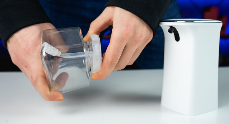Первый шаг — открутить емкость для мыла от диспенсера.