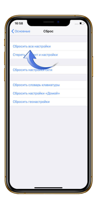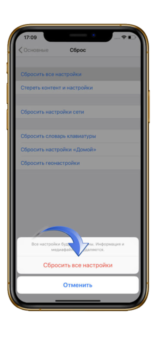 В пункте «Сброс» следует нажать на «Сбросить все настройки», далее потребуется ввести пароль от Айфона и подтвердить свои действия во всплывающем окне.