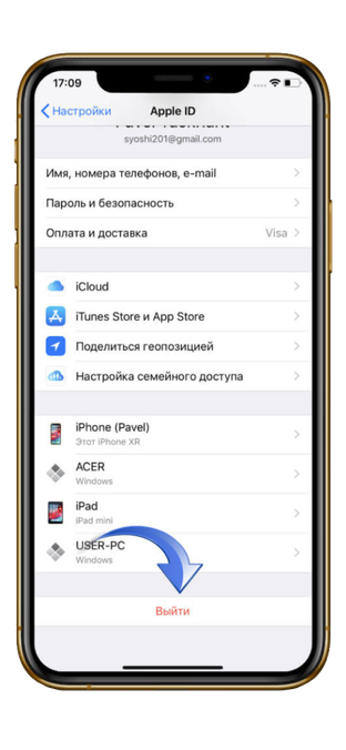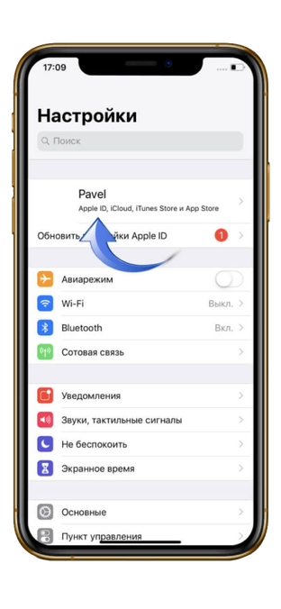 До сброса настроек вам потребуется выйти из учетной записи Apple ID. Для этого нужно зайти в «Настройки» и открыть первый пункт.