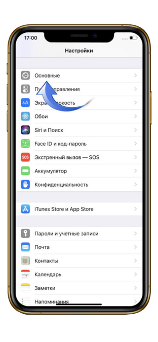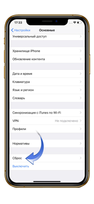 Затем открываете главное меню в приложении «Настройки» — пункт «Основные» — пункт «Сброс» (расположен внизу списка).