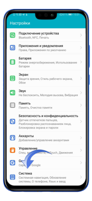 Первый шаг — открытие встроенного приложения «Настройки». Далее нажимаете на пункт «Система», который расположен внизу.