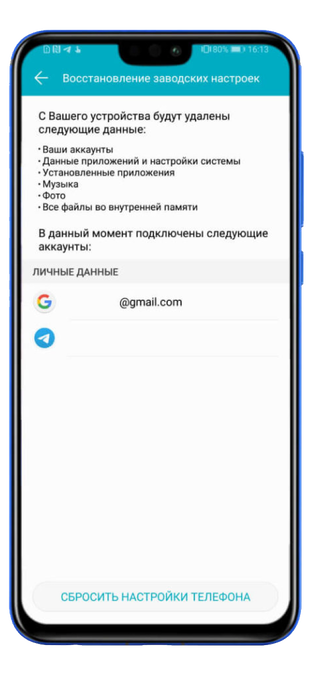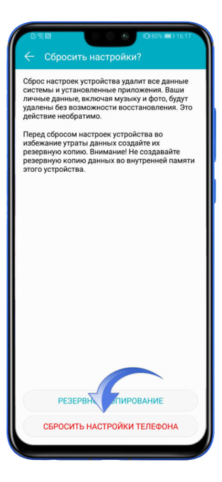 Honor сообщит вам, какие данные будут удалены. Поэтому учтите, что заранее вам нужно перенести важные данные на другой носитель. Если у вас установлен пароль на смартфоне, его потребуется ввести.