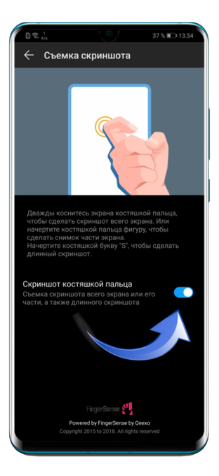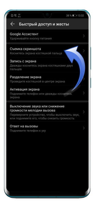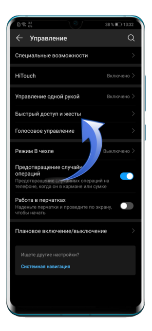 Более дорогие смартфоны Huawei предоставляют пользователям возможность делать скриншоты с помощью фаланг пястных костей (костяшками). Чтобы активировать данную функцию, необходимо пройти по следующему пути: «Настройки» — «Управление» — «Быстрый доступ и жесты».