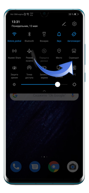 Шторка уведомлений прячется вверху экрана. Для ее открытия необходимо провести пальцев вниз. Среди всех представленных возможностей вам нужно найти иконку скриншота и нажать на нее.
