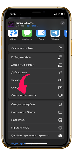 В открывшемся меню отыщите пункт «Сохранить как видео».