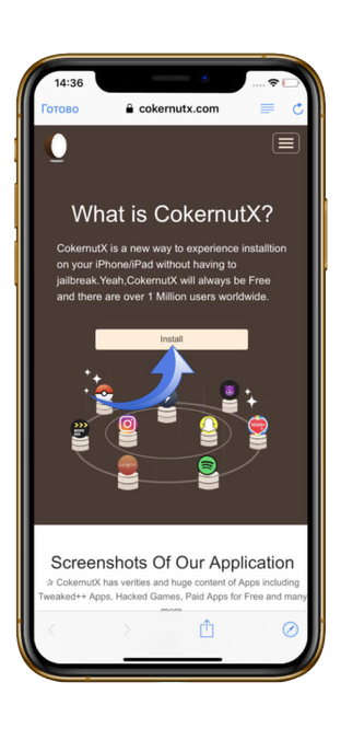 Первый шаг — открыть с iPhone сайт cokernutx.com и нажать на кнопку Intsall.