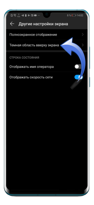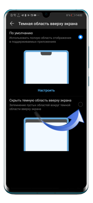 Рабочая система предложит вам два варианта: «По умолчанию» или «Скрыть темную область вверху экрана». Вам нужно нажать на последний пункт.
