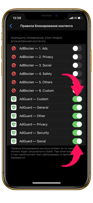 Выставьте активное значение всем пунктам приложения AdGuard.