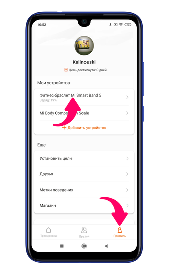 Осуществив подключение фитнес-трекера Сяоми к смартфону, зайдите в приложение Mi Fit, далее откройте вкладку «Профиль» и кликните на свой трекер.