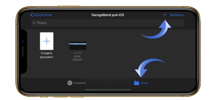 Затем откройте вкладку «Обзор», которая находится в нижней части справа. Отыщите папку «GarageBand для iOS» и нажмите на «Выбрать».