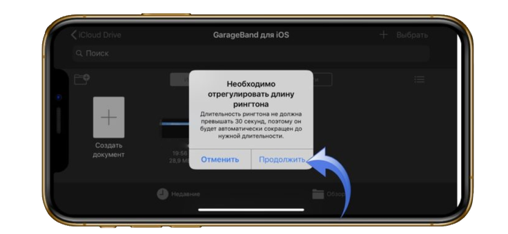 Продолжительность рингтона для Айфона не должна превышать 30 секунд. Поэтому вам нужно нажать на иконку плюса, расположенную в правой верхней части дисплея.