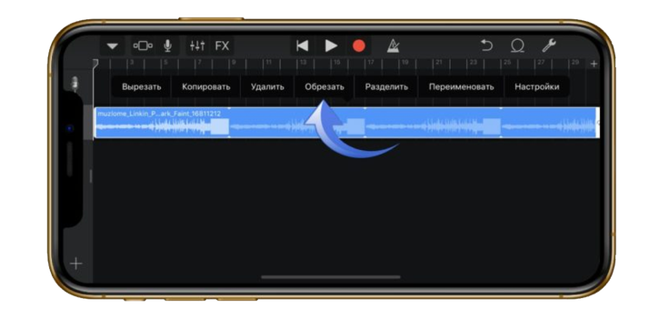 Затем вам нужно выбрать эту часть мелодии. Для этого необходимо нажать на сам трек на таймлайне, а в появившемся подменю нажать на «Обрезать».