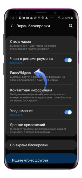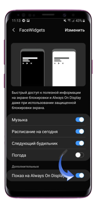 После этого вам нужно вернуться в раздел «Экран блокировки» и открыть пункт FaceWidgets. В данном разделе вы можете выбрать дополнительную информацию, которая будет отображаться на «Всегда включенном дисплее» . Важно: обязательно активируйте нижний переключатель, в противном случае настройки не будут применены к AoD.