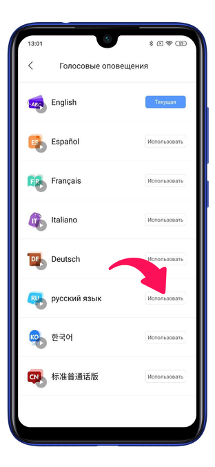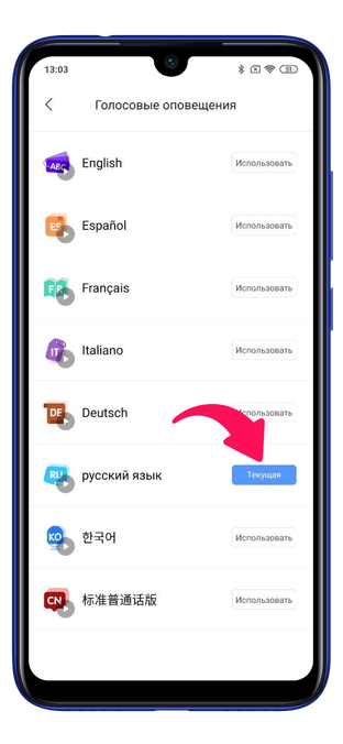 Чтобы изменить язык, выберите «Голосовые оповещения».