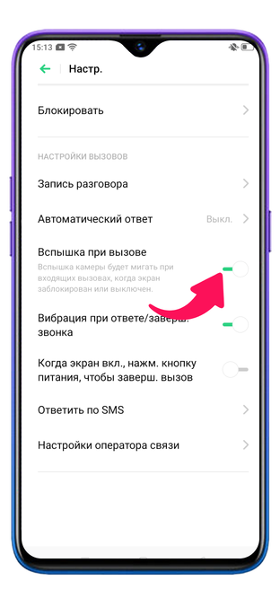 Поставьте переключатель в активное положение рядом с пунктом «Вспышка при вызове».