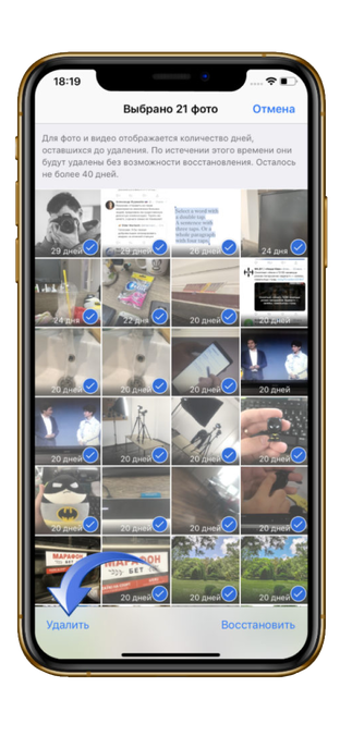 Кстати, чтобы освободить память в Айфоне, вы можете удалить ненужные фотографии в папке «Недавно удаленные». Для этого вам нужно выделить все изображения и нажать на «Удалить».