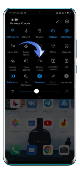 Данный вариант прост в реализации, а также имеется практически на всех аппаратах Huawei. Для записи вам потребуется опустить шторку уведомлений вниз и нажать на иконку с видеокамерой.