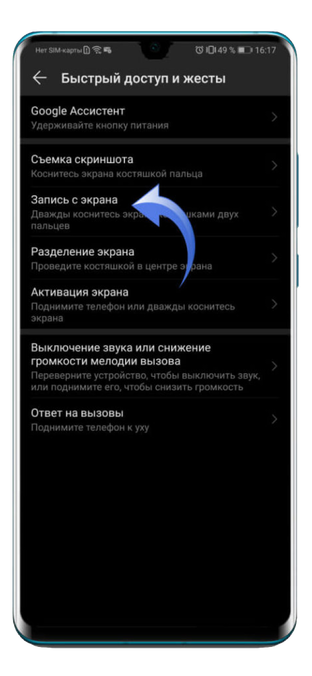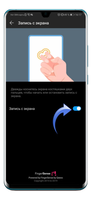 Вам следует активировать чекбокс «Запись с экрана». Для начала и завершения записи необходимо два раза стукнуть костяшками двух пальцев по дисплею смартфона.