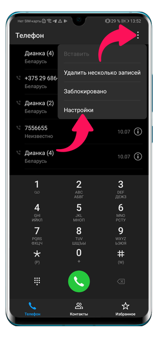 Затем откройте приложение «Телефон» и перейдите в «Настройки», нажав на иконку с тремя точками.