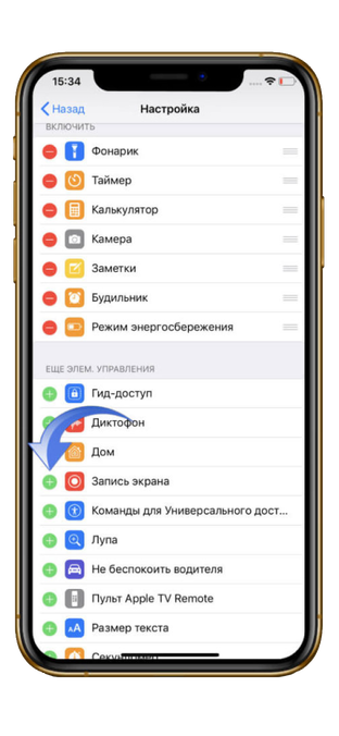 Здесь следует нажать на иконку с зеленым плюсом, расположенную в пункте «Запись экрана».