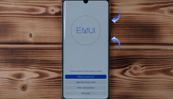 Далее необходимо одновременно удержать кнопку включения и верхнюю кнопку громкости. Когда отобразится логотип Huawei, следует отпустить кнопку питания. А вот кнопку громкости придется удерживать до появления меню Recovery.