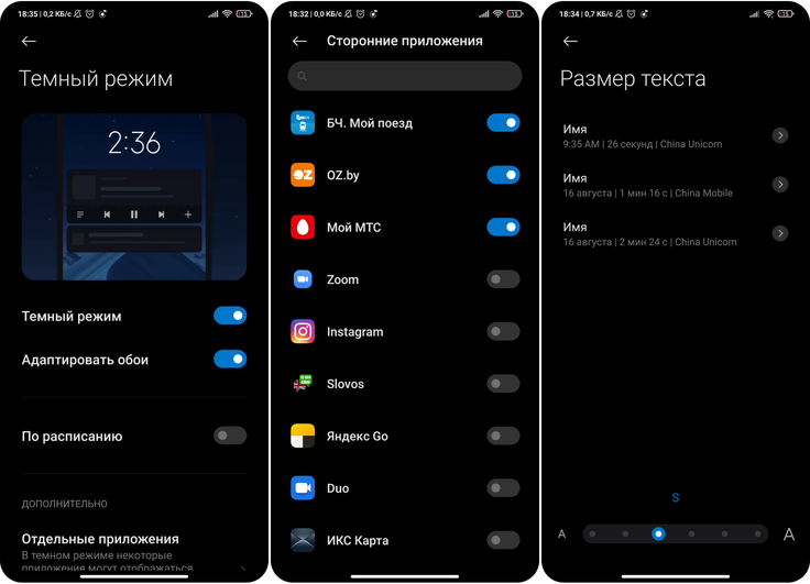 Темная тема пользуется большой популярностью, поэтому Xiaomi доработала данный режим. В MIUI 12 пользователи могут создать список приложений, где использование темного оформления будет игнорироваться. Претерпел изменения и дизайн настроек, и шрифт. Для максимального комфорта можно настроить размер шрифта под себя.