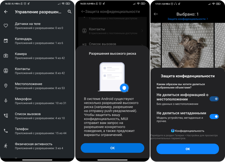 Конфиденциальность пользовательских данных — приоритетная задача для любого производителя. Так в MIUI 12 появились дополнительные возможности защиты. Настроить разрешения каждого приложения можно в разделе «Защита конфиденциальности». Пункт «Разрешения высокого риска» отслеживает подозрительную активность и оповещает об этом. Также при отправке фотографий появилась возможность скрыть метаданные и геолокацию