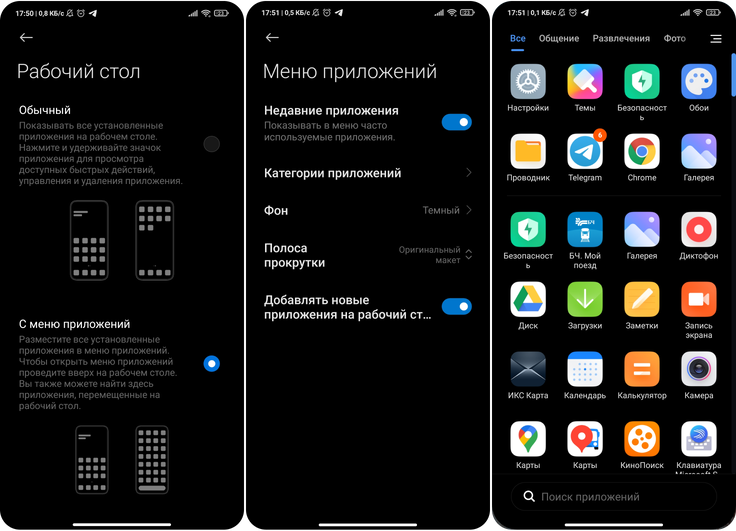 Появилась удобная сортировка приложений. В предыдущих версиях прошивки Сяоми ярлыки размещались на рабочем столе, также их можно было группировать в папки. Сейчас же в разделе «Рабочий стол» доступно меню приложений. К сожалению, сортировка происходит автоматически, но своего рода альтернатива лаунчерам имеется. Еще отметим возможность регулировки размера ярлыков приложений, кому-то может и пригодится.